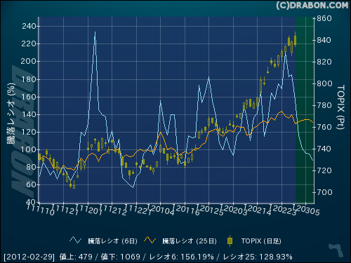 騰落レシオ(6日):156.19% (-29.24)