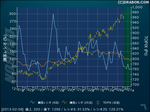 騰落レシオ(6日):91.53% (-23.28)