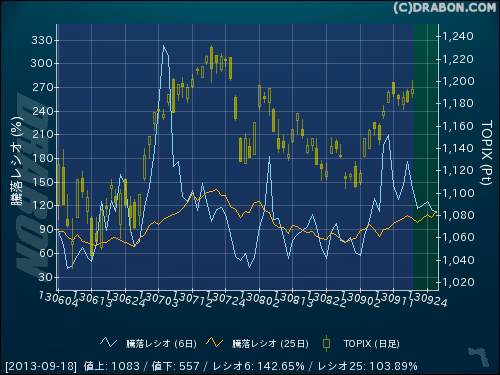 騰落レシオ(6日):142.65% (-33.64)