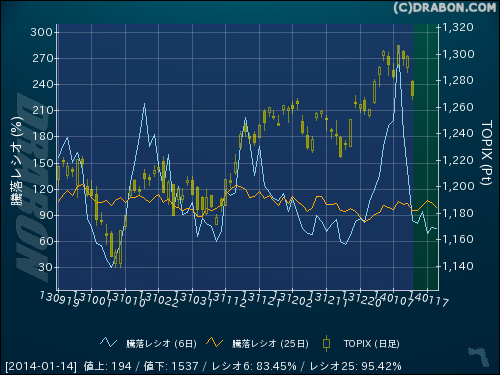 騰落レシオ(6日):83.45% (-57.75)