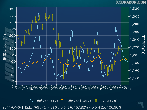 騰落レシオ(6日):167.82% (-10.39)