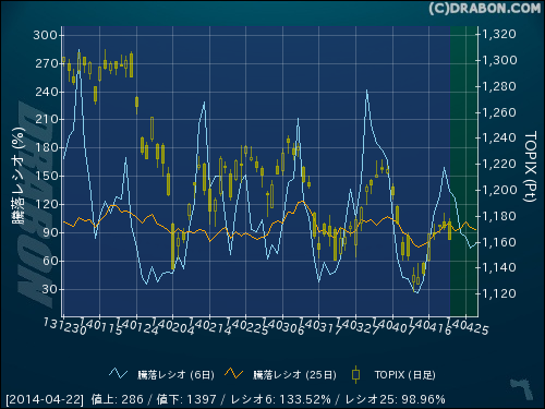 騰落レシオ(6日):133.52% (-26.27)