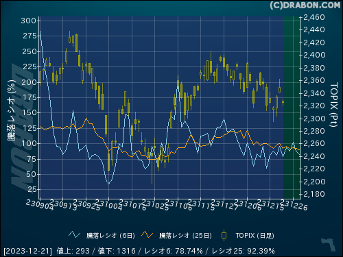 騰落レシオ(25日):92.39% (-7.34)