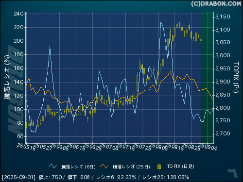 騰落レシオ(6日):82.23% (-9.80)