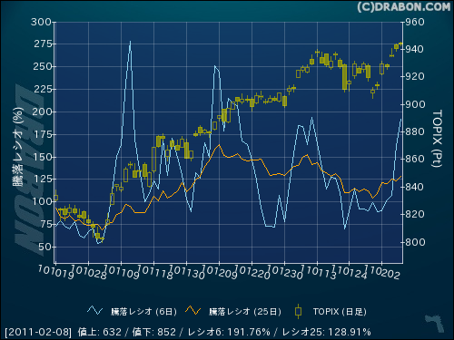 騰落レシオ(6日):191.76% (+29.35)