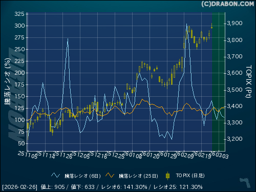 騰落レシオ(25日):121.30% (+6.17)